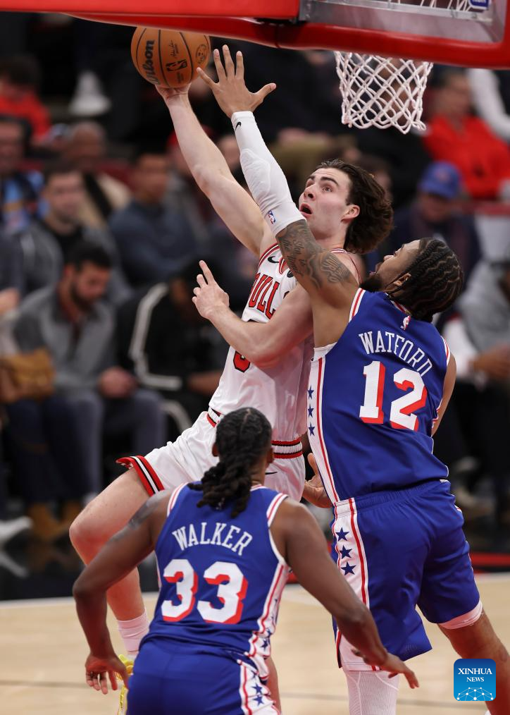 Chicago Bulls' Matas Buzelis (C) goes to the basket during the 2025-2026 NBA regular season match between Chicago Bulls and Philadelphia 76ers in Chicago, the United States, on Nov. 4, 2025. (Photo by Joel Lerner/Xinhua)