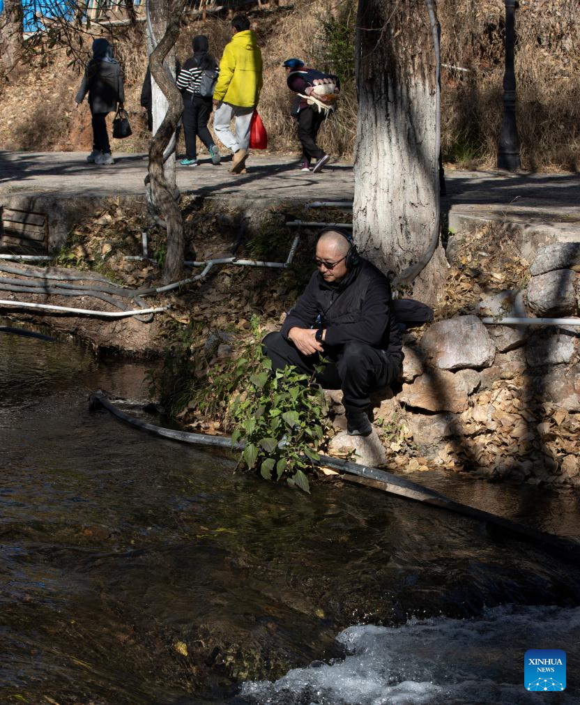 He Dehua collects the sounds of flowing water at a park at the ancient city of Lijiang, southwest China's Yunnan Province, Jan. 16, 2026. (Xinhua/Jiang Wenyao)