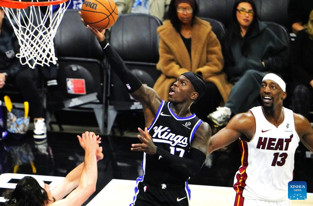 Sacramento Kings' Dennis Schroder (C) goes for a layup during the 2025-2026 NBA regular season basketball game between Miami Heats and Sacramento Kings in Sacramento, the United States, Jan. 20, 2026. (Xinhua/Wu Xiaoling)