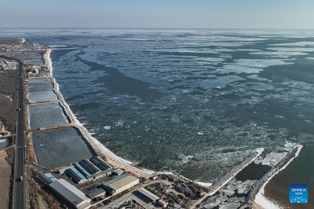 A drone photo taken on Jan. 21, 2026 shows a view over sea ice in Xingcheng of Huludao City, northeast China's Liaoning Province. (Photo by Tian Jia/Xinhua)