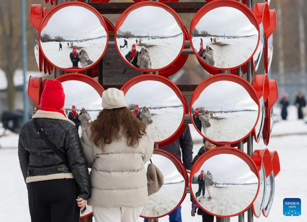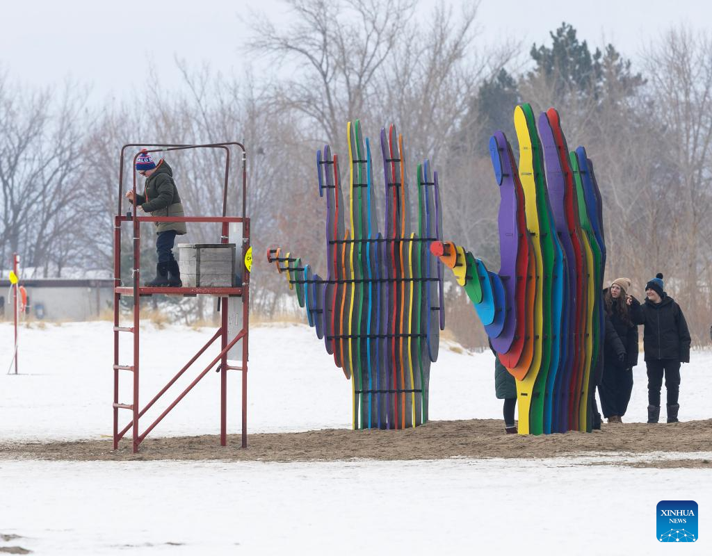 People view an art installation at the public exhibition of the 2026 Winter Stations international design competition in Toronto, Canada, Feb. 16, 2026. Winter Stations is an international design competition held annually in Toronto. It provides a platform for designers to reimagine lifeguard stations as art installations. (Photo by Zou Zheng/Xinhua)
