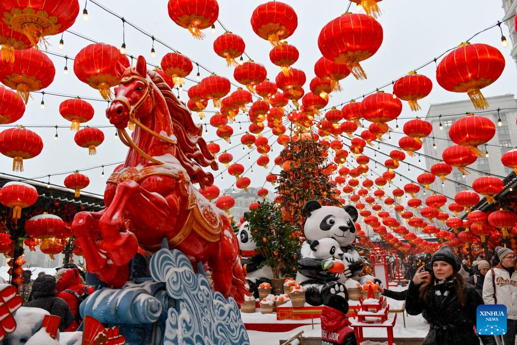 Visitors watch decorations in celebration of the Chinese New Year in Moscow, Russia, on Feb. 16, 2026. (Photo by Alexander Zemlianichenko Jr/Xinhua)