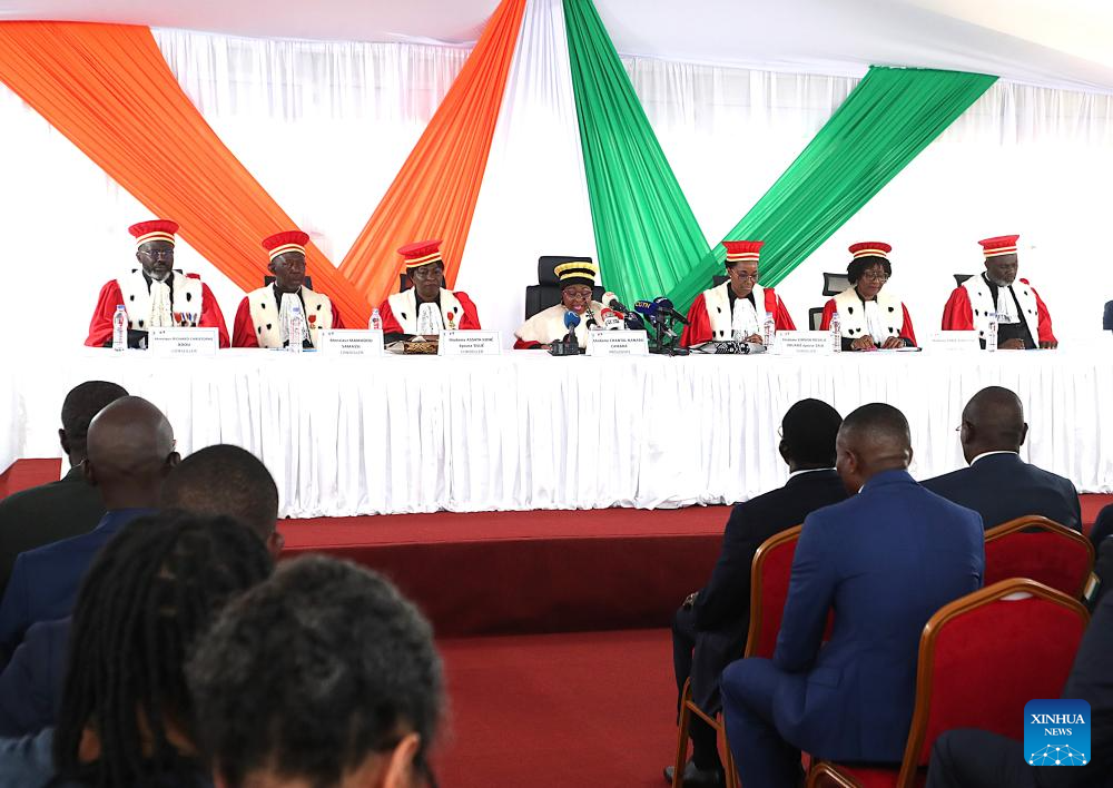 This photo taken on Nov. 4, 2025 shows the Constitutional Council of Cote d'Ivoire in Abidjan, Cote d'Ivoire. President of Cote d'Ivoire's Constitutional Council Chantal Camara on Tuesday officially confirmed incumbent President Alassane Ouattara as the winner of the presidential election held on Oct. 25 during a ceremony in Abidjan. (Photo by Yvan Sonh/Xinhua)