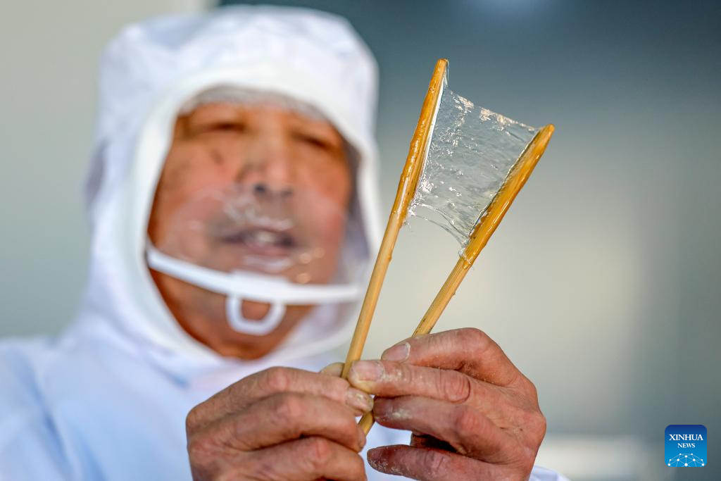 Jin Huimin, an inheritor of the making crafts of character-inlaid candy, observes syrup thickness in Qimen County of Huangshan City, east China's Anhui Province, Jan. 13, 2026.
