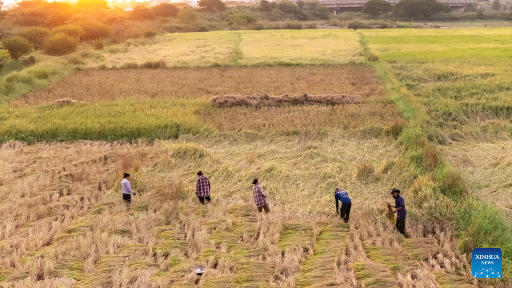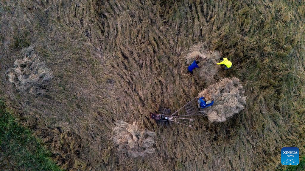 An aerial drone photo taken on Nov. 2, 2025 shows farmers harvesting rice in a rice field in Vientiane, Laos. Local farmers have recently been busy harvesting the rice as the harvest season comes. (Photo by Kaikeo Saiyasane/Xinhua)