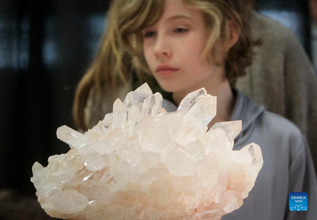 A crystal rock is dispalyed during the Gem and Mineral Show in Vancouver, British Columbia, Canada, on March 25, 2022. The three-day show features about 100 vendors from across Canada with their gem, mineral and rare fossil collections. (Photo by Liang Sen/Xinhua)