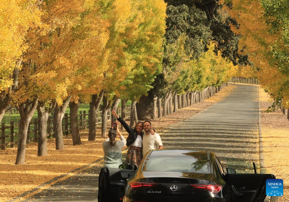 Tourists pose for photos by ginkgo trees at Napa Valley in California, the United States, Nov. 4, 2025. (Photo by Liu Yilin/Xinhua)