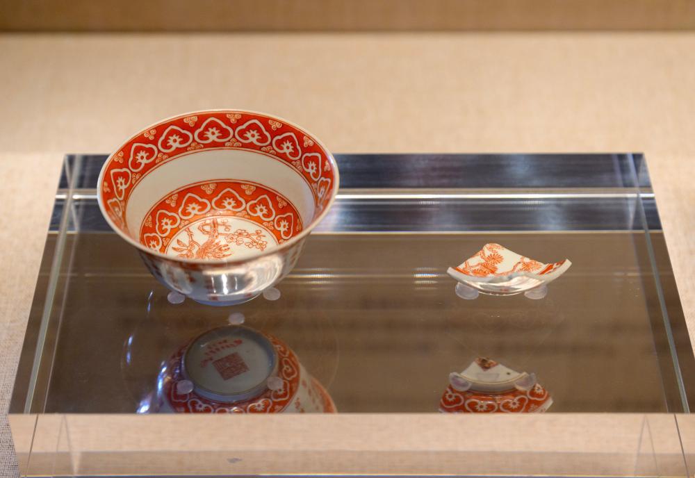 这是展出的故宫造办处旧址出土的白釉矾红彩三清茶碗残片与故宫院藏清代白釉矾红彩三清茶碗(11月3日摄)。