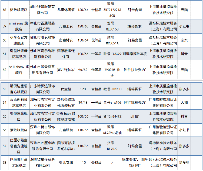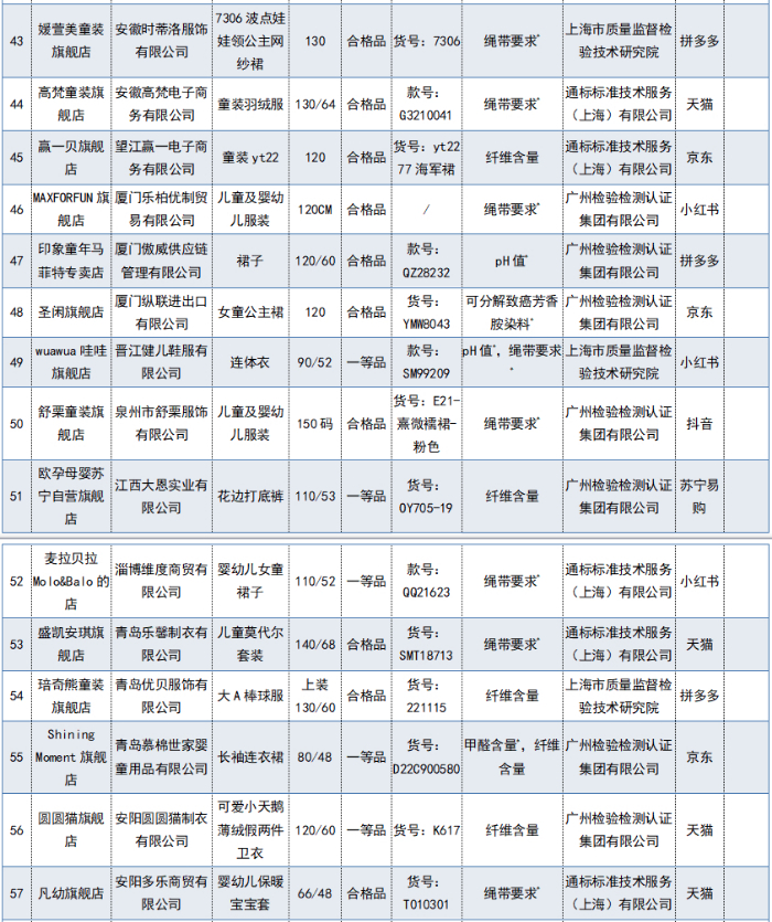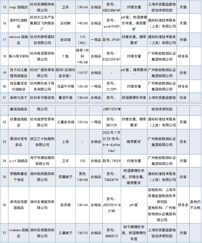2022年网售儿童及婴幼儿服装质量国家监督抽查不合格产品及企业名单