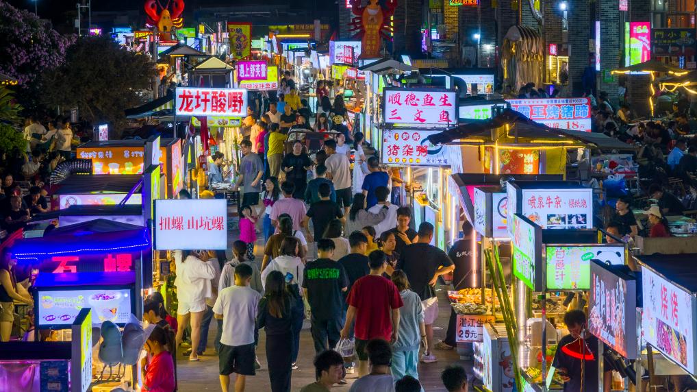 2025年10月19日晚,广西梧州市长洲区红岭街道水云天夜市灯火璀璨、人潮涌动。市民和游客穿梭于摊位间,品尝当地特色美食,尽情享受丰富多彩的夜生活。