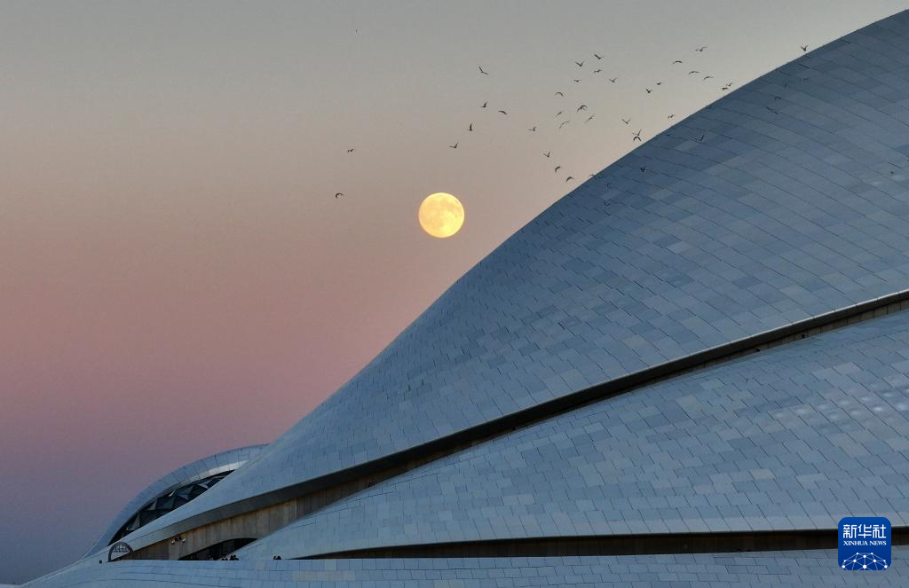 10月6日在黑龙江省哈尔滨大剧院拍摄的中秋满月(无人机照片)。