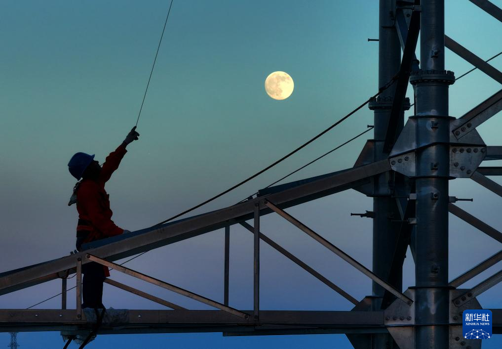 10月6日,在湖南省衡阳市雁峰区,高塔架线工人在月光的映射下施工(无人机照片)。