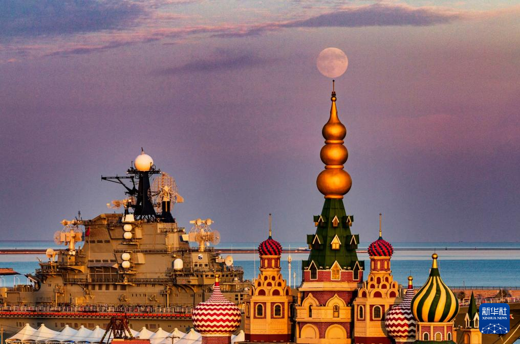 10月6日在天津市滨海新区泰达航母主题公园拍摄的中秋满月(无人机照片)。