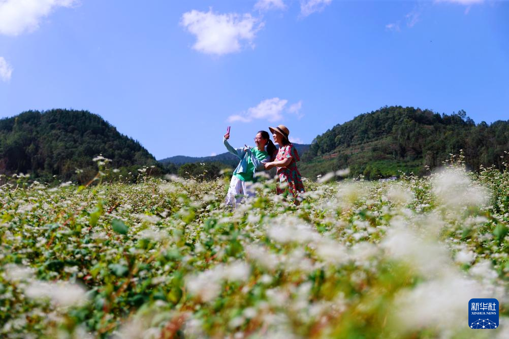 10月10日,游客在重庆市黔江区水田乡石郎村中药材基地观赏金荞麦花。