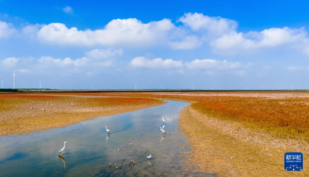 10月11日,候鸟在江苏东台条子泥湿地栖息、觅食(无人机照片)。