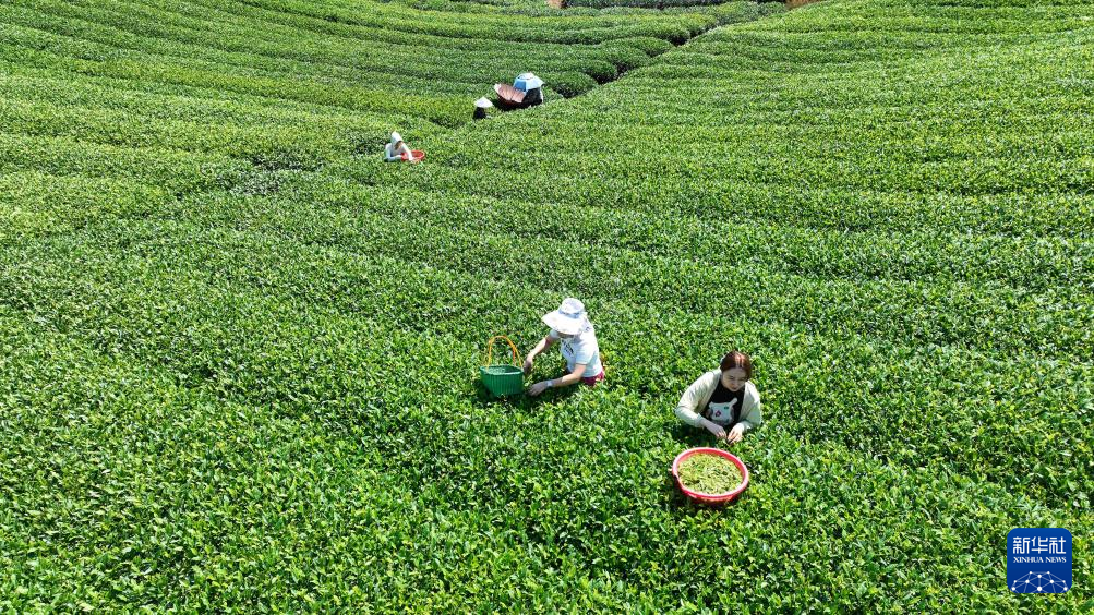 10月10日,游客在浙江省湖州市德清县莫干山镇何村村茶园体验秋茶采摘(无人机照片)。