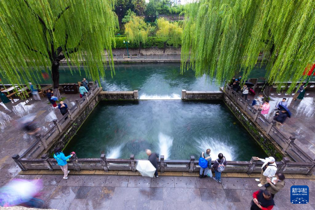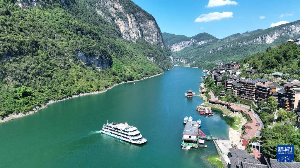 10月9日拍摄的重庆市酉阳土家族苗族自治县龚滩古镇:鳞次栉比的土家吊脚楼与一江碧水、绝壁峡谷和往来船只构成一幅山水画卷(无人机照片)。