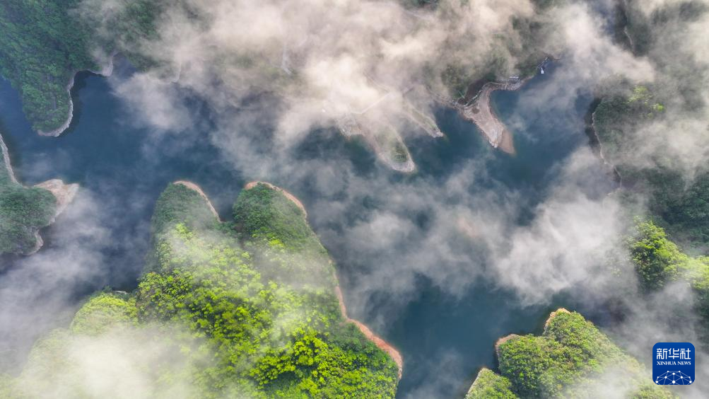 10月8日拍摄的贵州省铜仁市石阡县枫香乡鸳鸯湖日出云雾景观(无人机照片)。