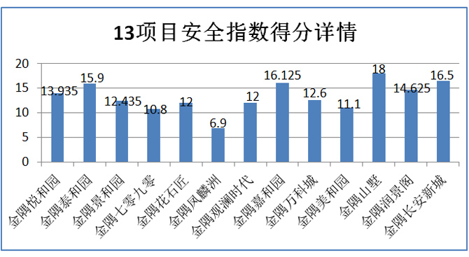 根據上述兩個表格發現,整體來看,金隅各小區安全隱患較多,13個項目中共10個項目存在安全隱患,占77%。其中偷盜搶劫比例最多,占54%,其次為房屋質量,占46%,項目中金隅花石匠、金隅觀瀾時代、金隅嘉和園三個項目問題比較多。