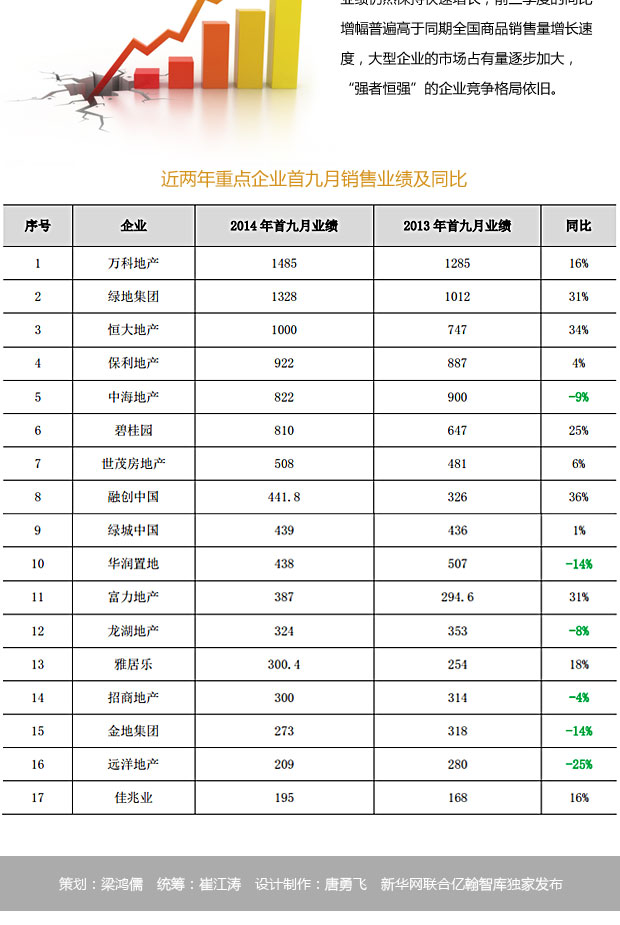 新華房產“房企業績榜”是新華網聯合房地產咨詢服務機構億翰智庫,結合中國大陸以房產開發為主營業務的企業經營數據(住宅),獨家發布銷售業績排行榜(TOP 50)。本欄目每月首周更新,時間跨度為從當年初到發布月(不含)止,所選取物業屬性主要針對可售型住宅物業,數據來源億翰智庫數據及各企業公報等。