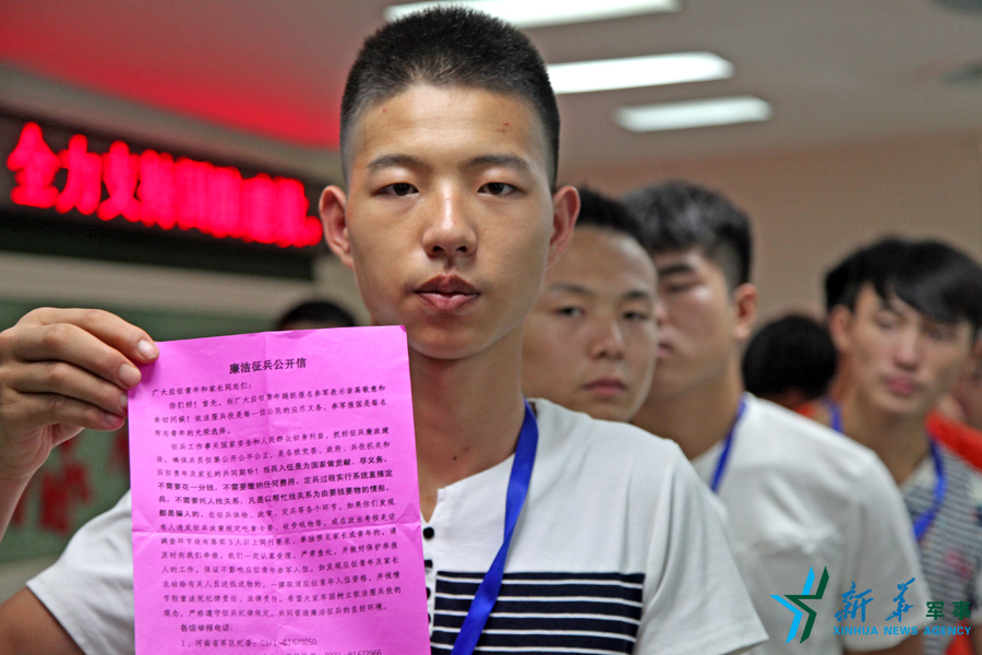 ????新華網(wǎng)鄭州8月11日電(雒根生)“當(dāng)兵入伍是為國家做貢獻盡義務(wù),不需要繳納任何費用。凡是以幫忙找關(guān)系為由要錢要物的情形,都是騙人的!”河南省武陟縣喬廟鄉(xiāng)18周歲的預(yù)征對象王云祥10日收到了武陟縣征兵辦印制的《廉潔征兵公開信》。為確保不發(fā)生一起違反征兵政策現(xiàn)象,武陟縣征兵辦公室專門印制1000份廉潔征兵公開信發(fā)放給每一位參檢對象及家長,并公布了省市縣三級監(jiān)督舉報電話。