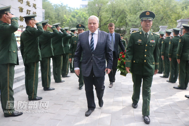俄羅斯駐華大使安德烈·杰尼索夫向武警警衛部隊李登貴烈士雕塑敬獻花籃