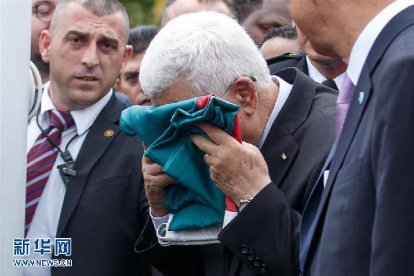 ????資料圖:在紐約聯(lián)合國總部,巴勒斯坦總統(tǒng)阿巴斯在升旗儀式上親吻巴勒斯坦國旗。新華社記者李木子攝