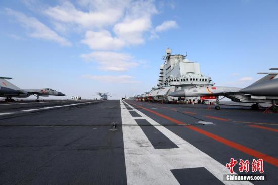資料圖:2016年12月23日,在黃海某海空域,多批次殲-15艦載戰(zhàn)斗機從遼寧艦飛行甲板起飛升空,開展了空中加受油、空中對抗等多項訓練任務。 中新社發(fā) 莫小亮 攝