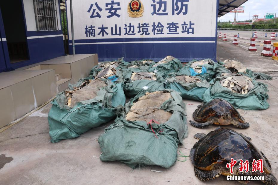 ????6月27日,廣西防城港邊防支隊(duì)楠木山邊境檢查站執(zhí)勤官兵在對(duì)一輛重型廂式貨車?yán)袡z查時(shí),查獲涉嫌非法運(yùn)輸玳瑁標(biāo)本2只、鯊魚皮11袋。這兩只玳瑁標(biāo)本重量共達(dá)到40多公斤,而11袋鯊魚皮重約1噸。據(jù)悉,玳瑁是國家二級(jí)重點(diǎn)保護(hù)野生動(dòng)物,已被列入《世界自然保護(hù)聯(lián)盟》(IUCN)2012年瀕危物種紅色名錄。(張振國)