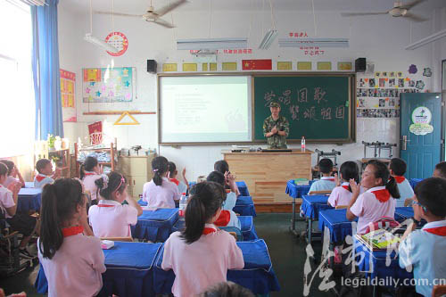????“起來,不愿做奴隸的人們,把我們的血肉鑄成我們新的長城……”一進門就聽到爵溪小學四年級三班響起了嘹亮的國歌聲,小朋友們正在爵溪邊防官兵的帶領(lǐng)下學唱國歌。
