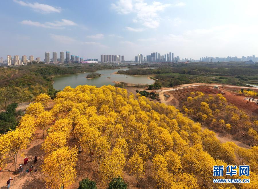 近日,廣西南寧市青秀山風景區(qū)黃花風鈴木盛放,吸引眾多游人前來觀賞。