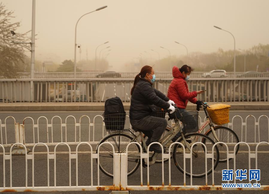 3月15日,市民騎車行駛在北京德勝門附近的道路上。當日,我國北方多地出現沙塵天氣。新華社記者 賈浩成 攝