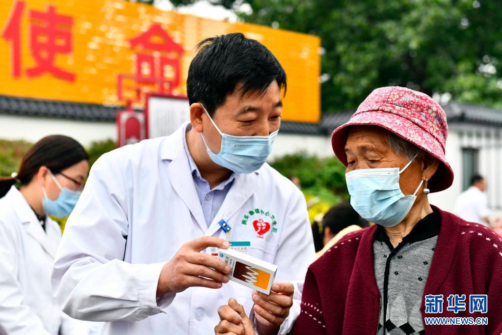 5月21日,在棗莊市臺兒莊區澗頭集鎮褚提樓村,“學黨史惠民”醫療小分隊為群眾開展送醫、送藥服務。