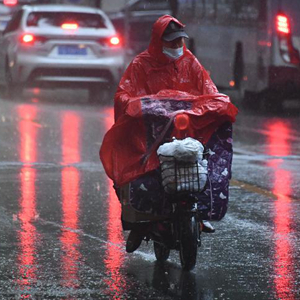 7月12日, 在北京市海淀區(qū)中關(guān)村街道科學(xué)院南路,市民在雨中騎行。