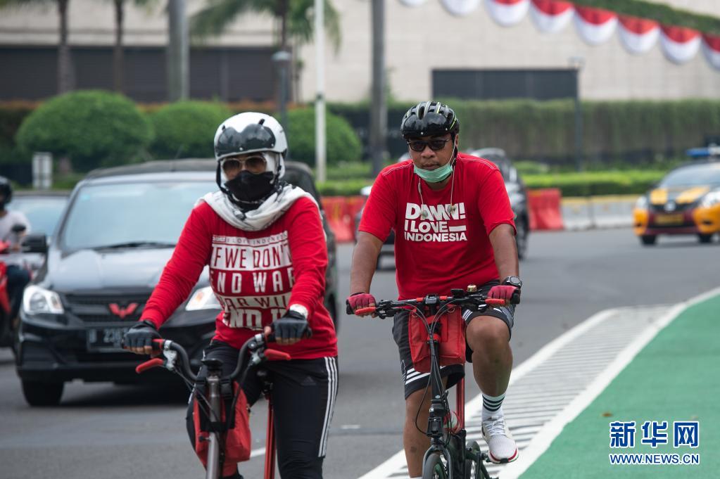 8月17日,人們身穿紅白配色服裝在雅加達街頭騎行,慶祝印度尼西亞獨立日。8月17日是印度尼西亞獨立日。新華社發(維里攝)