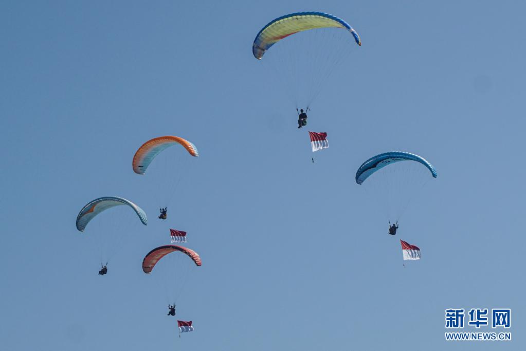 8月17日,懸掛印度尼西亞國旗的滑翔傘飛過巴厘島上空。8月17日是印度尼西亞獨立日。新華社發(比辛拉西攝)