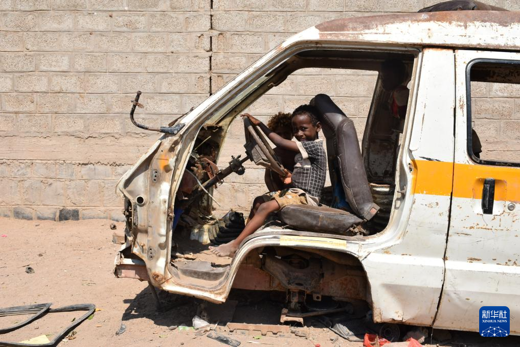 11月3日,在也门南部城市亚丁郊区,流离失所的孩子在一处营地将损毁的汽车当玩具。
