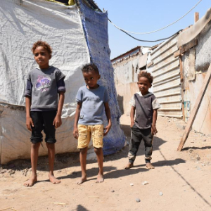 11月3日,在也门南部城市亚丁郊区,流离失所的孩子站在一处营地的帐篷外。