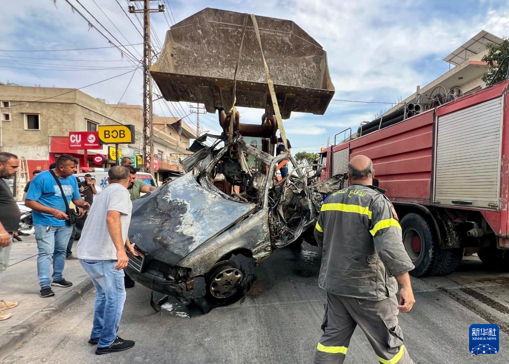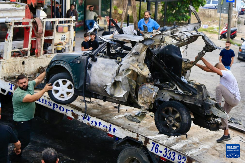 11月3日,在黎巴嫩南部奈拜提耶省杜韦尔镇,人们在以色列空袭现场清理车辆残骸。新华社发(阿里·哈希绍摄)
