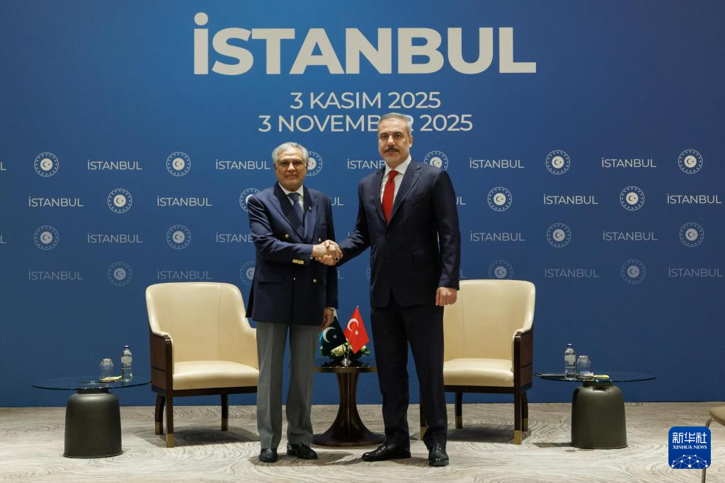 11月3日,土耳其外长费丹(右)在伊斯坦布尔会见巴基斯坦副总理兼外长达尔。