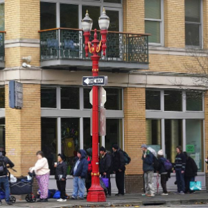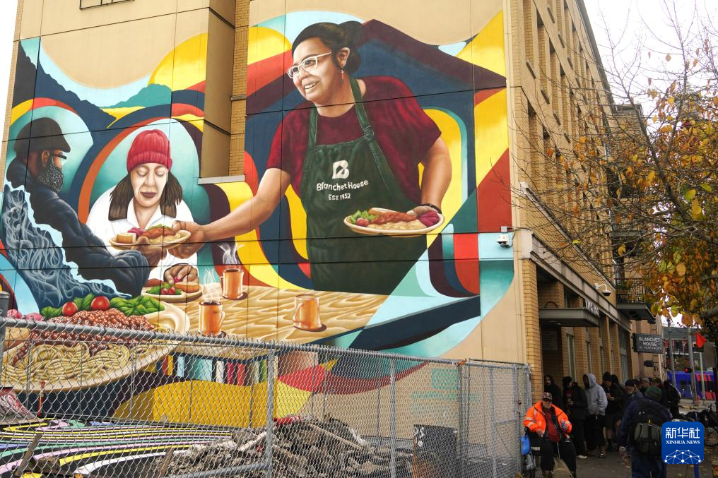 11月4日,在美国俄勒冈州波特兰,等待领取免费食物的人们在街头排起长队。