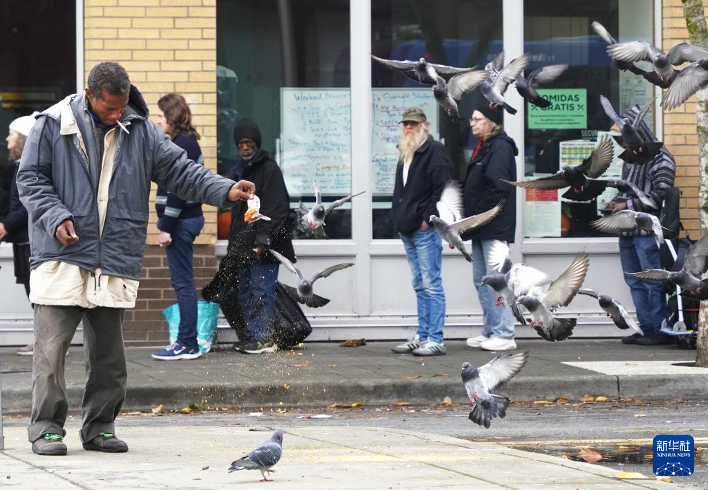 11月4日,在美国俄勒冈州波特兰,无家可归者在街头喂鸽子。