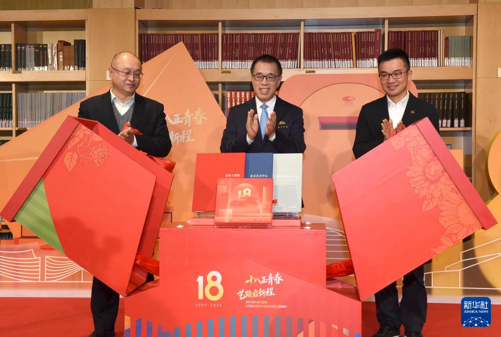 12月22日,国家大剧院院长王宁(中)、北京工艺美术出版社社长夏中南(左)、中信出版集团董事长陈炜共同见证建院18周年“一院三址”系列画册和“艺术礼物”系列普及读物的全新发布。