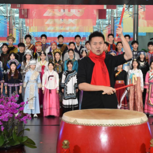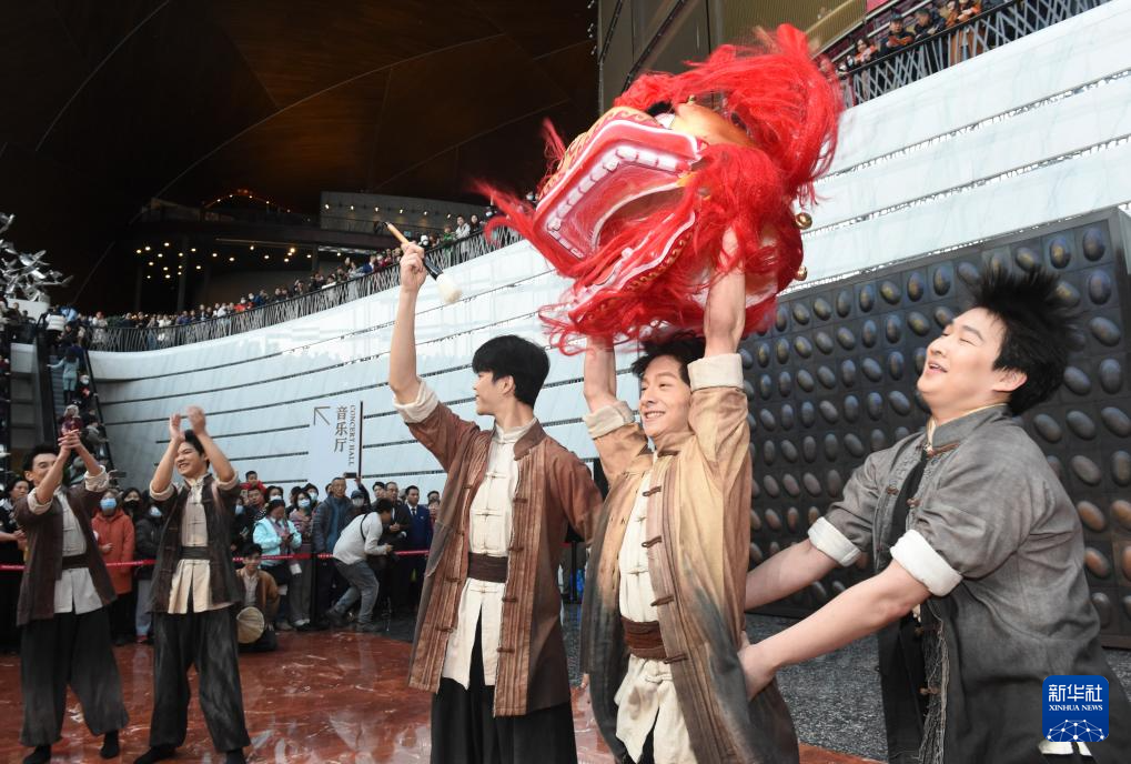 12月22日,演员在国家大剧院北门入口处敲响迎宾鼓,拉开活动序幕。