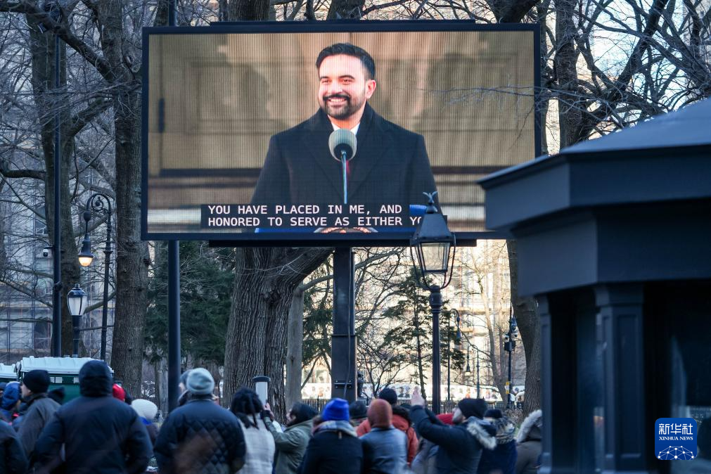 1月1日,在美国纽约,街头大屏幕播放祖赫兰·马姆达尼在就职典礼上的讲话。