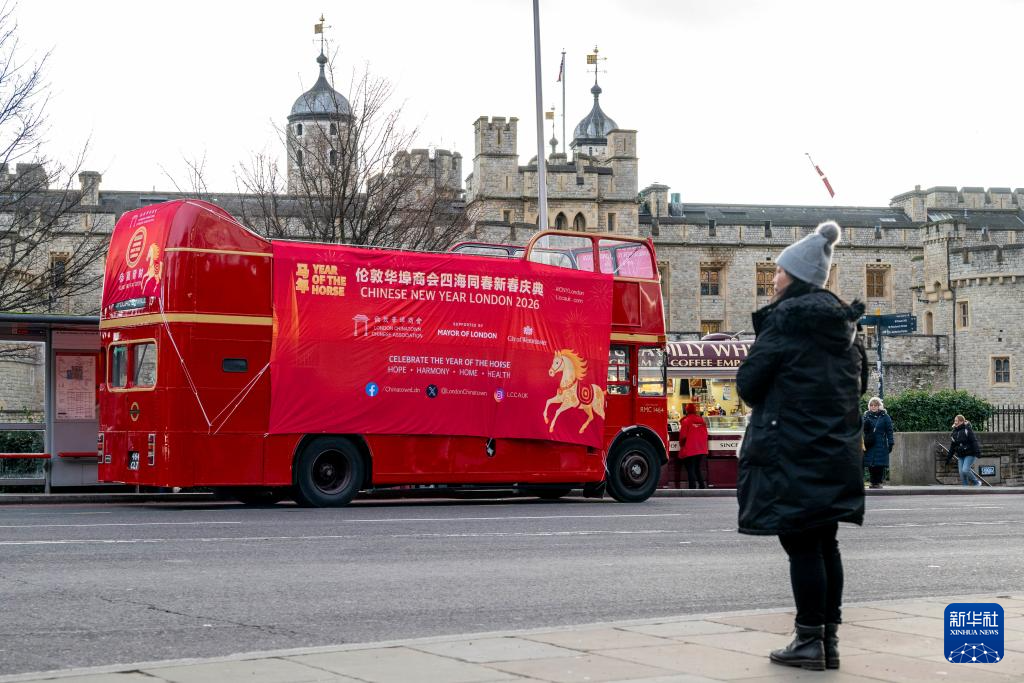 当日,装饰着马年新春主题元素的红色双层巴士穿梭于英国伦敦大街小巷,迎接中国农历新年的到来。