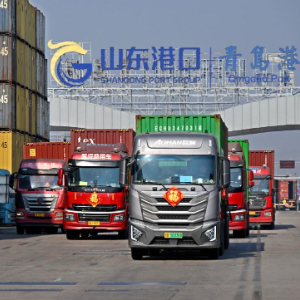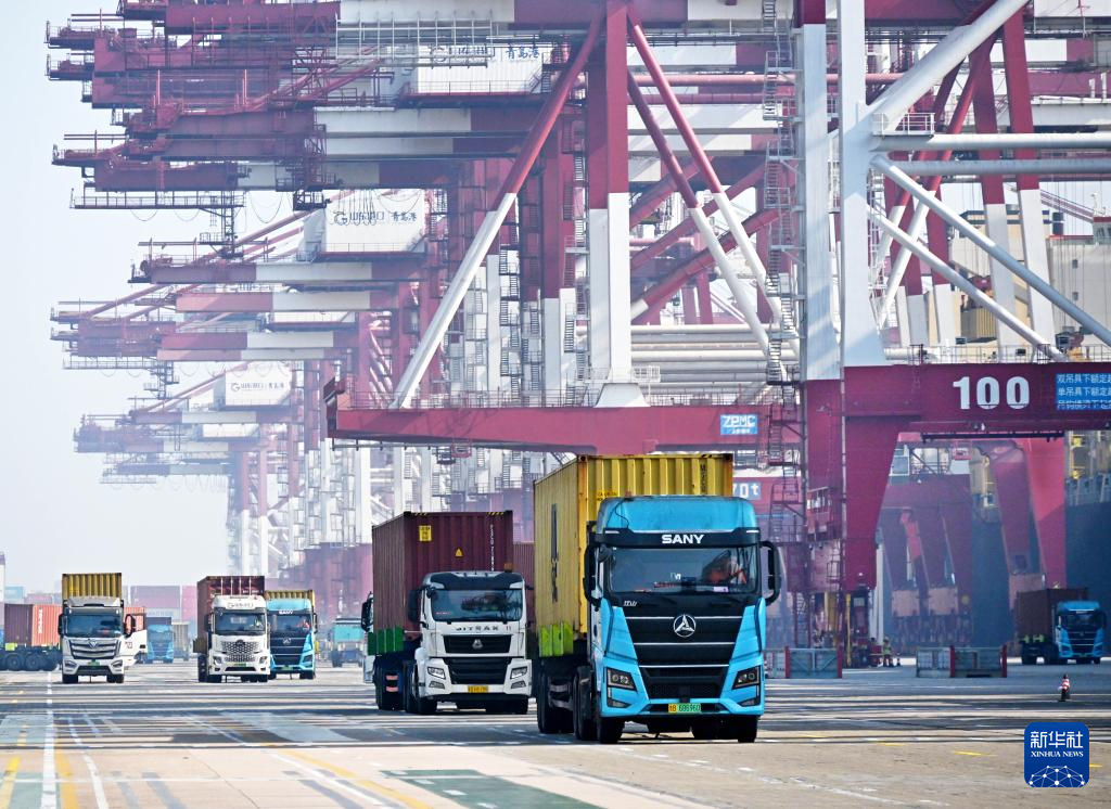 2月18日,卡车在青岛港前湾集装箱码头运送集装箱。