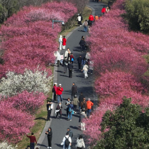 春节期间,浙江杭州西溪湿地梅花进入盛花期,吸引游客前来踏春赏花。