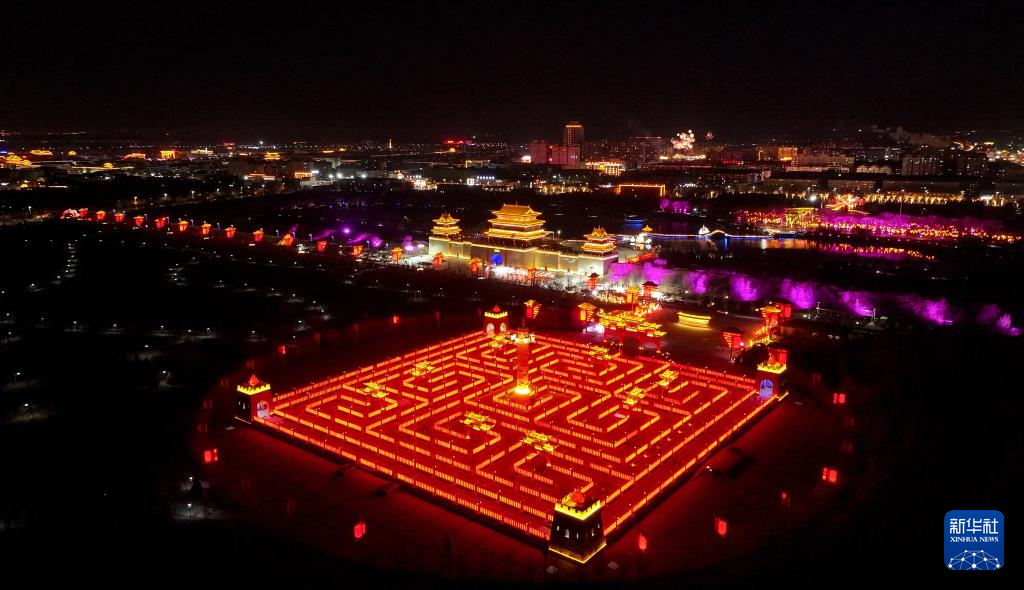 这是2月18日拍摄的宁夏盐池县九曲民俗文化园和长城关夜景(无人机照片)。