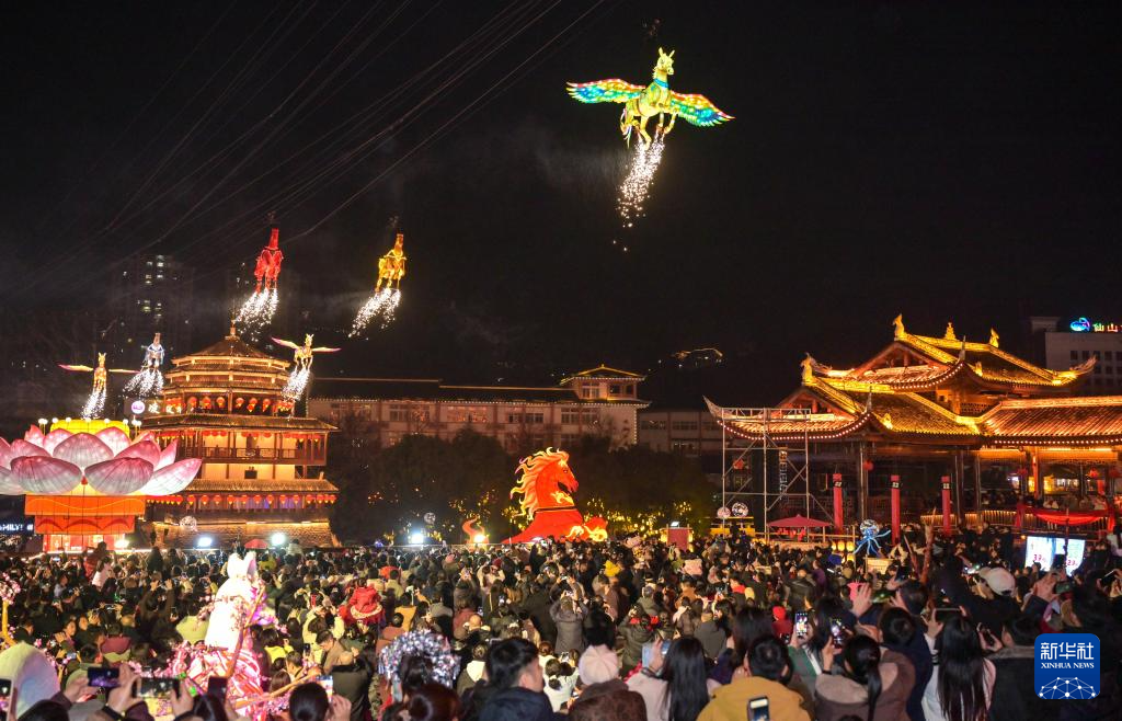 2月18日晚,游客在湖北省宣恩县城观赏彩灯“骏马”凌空飞腾。